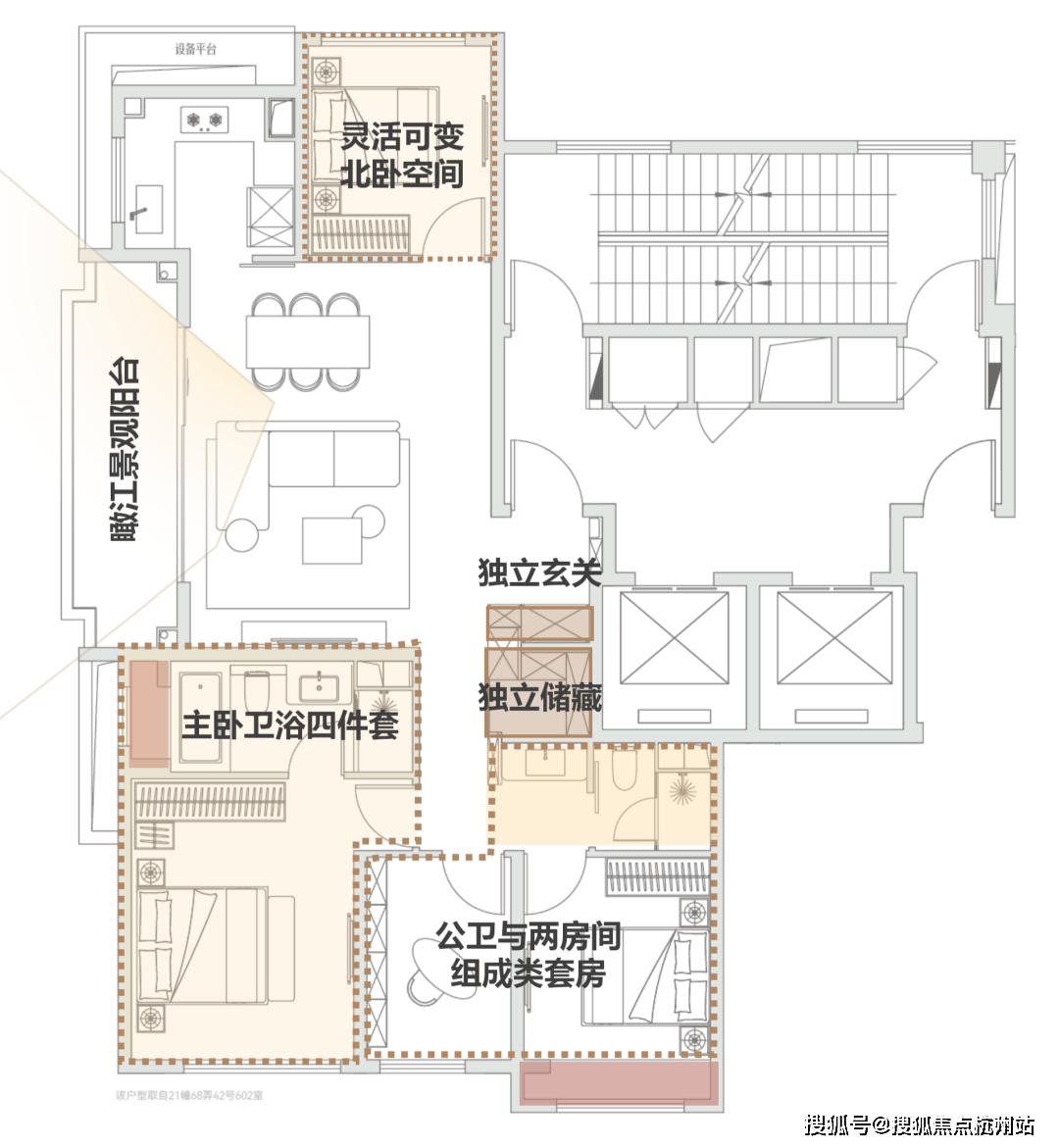 或者,也可以调整为北侧套房,北卧可组合自己的多功能房间,类三套房各有私密空间。